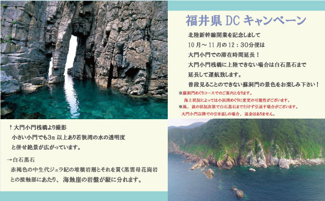 北陸新幹線開業を記念しまして10月~11月の12:30分便は 大門小門での滞在時間延長!大門小門桟橋に上陸できない場合は白石黒石まで 延長して運航致します。普段見ることのできない蘇洞門の景色をお楽しみ下さい! ※蘇洞門めぐりコースでのご案内となります。 海上状況によっては小浜湾めぐりに変更の可能性がございます。 ※風、波の状況次第で白石黒石まで行けず引返す場合がございます。 大門小門以降での引き返しの場合、返金はありません。