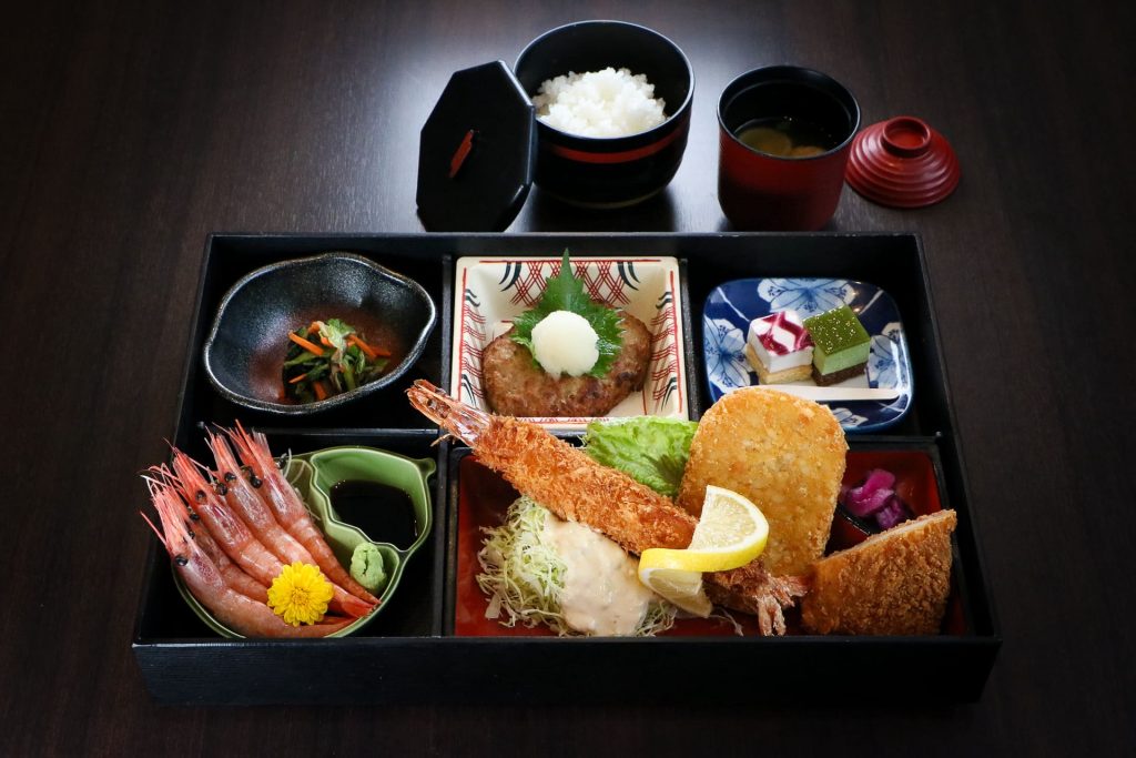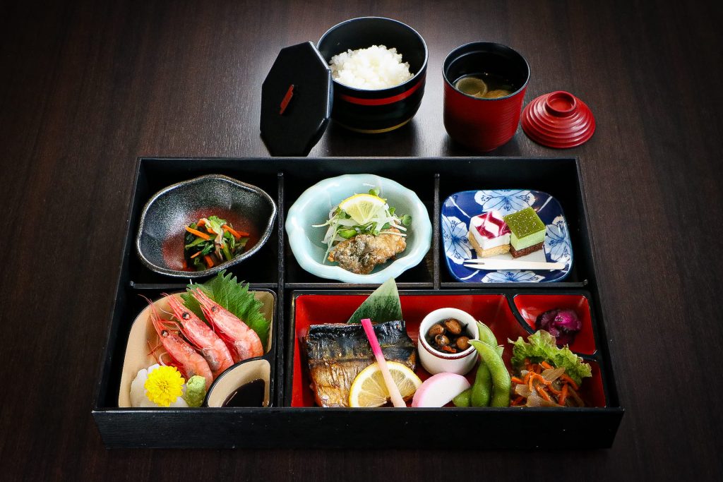若狭小浜の「醤油干し」を中心に、天ぷらと風味豊かな蕎麦を添えた御膳。