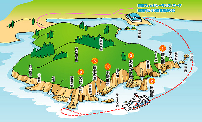 蘇洞門を描いた後半は特に美しく、遊覧船の絶景スポットとして有名な「大門」「小門」や「白糸の滝」「鎌の腰」も、ほぼ現在と同じ名称で登場します。