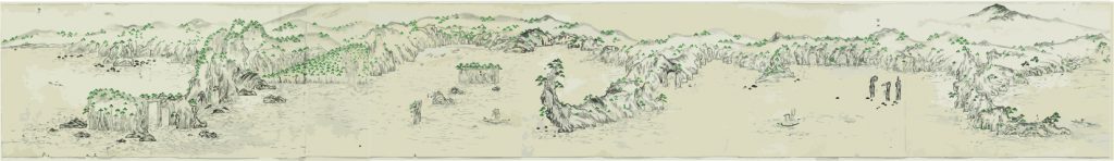 「紙本着色小浜城下蘇洞門景観図巻」(「蘇洞門景観図」)は、江戸時代中期~後期(18世紀中ごろ~19世紀初頭)の作成と推定される絵巻です。小浜市街の西端に位置する常高寺から、小浜八幡宮、小浜城、西津、甲ヶ崎などを経て、蘇洞門に至る海岸の風景が描かれています。